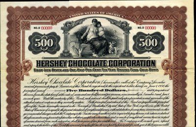 1920. $500. Specimen First Lien 7-1/2% Gold Bond. Chocolate-brown border. Seated allegorical woman with two children. Red specimen overprints, POC's and "00000" serial numbers. XF condition. Rare early famous chocolate makers bond. ABNC