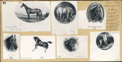 ca.1880's-1890's. 7 different proof vignettes of horses (6) and 1 bull. The vignettes range from 1.5 to 3.5 inches in size. All are printed on india paper and mounted on a large archival manila file envelope with archival notations. Titles include "Rarus"; "Rhode Island Perkins Horse Shoe Co."; "The Racer"; "Bulls Head"; "At the Trough" and 2 untitled. Printers are HLBNC and FBNC. Condition varies between Fine and Choice uncirculated. Please inspect. Rare and attractive horse and bull vignettes. HLBNC, FBNC.