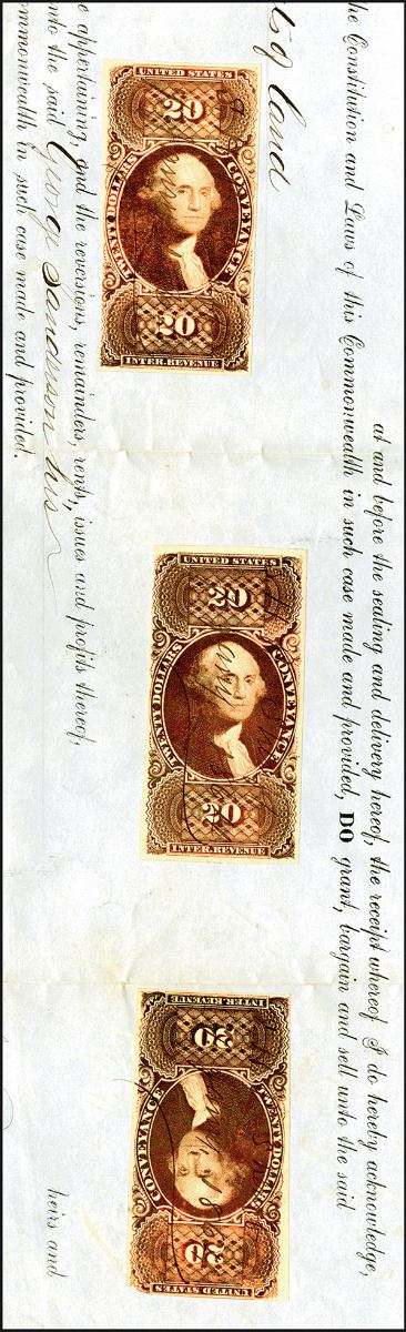 Wilkes Barre, PA. 1864. Scott R98a. Large format Deed with 3 single stamps, all appears VF to XF with the middle stamp showing excellent centering and not touching on any design; the second is touching on one small area and the third has as small corner tip missing. One of the stamps is tied, the second two have identical cancellations. The deed needs to have the folds reinforced.