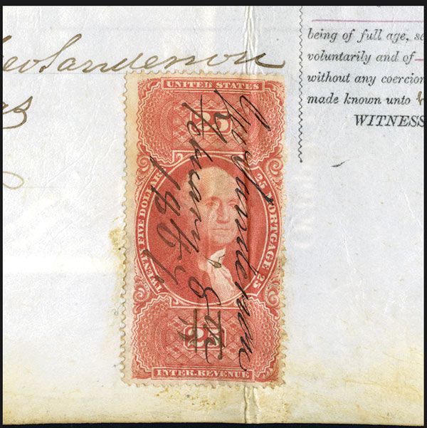 Philadelphia, PA. 1867. Vellum deed with a single perforated stamp. One vertical fold from where the document was folded.