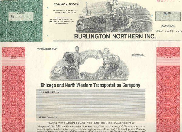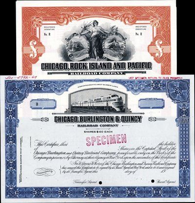 ca.1940's-80's. 7 different Specimen certificates, 3 stocks and 1 bond. All different colors and share amounts. All with various vignettes. Railroads include: Chicago Rock Island and Pacific Railroad Co., 40 Year 4-1/2% Income Bond; Chicago Burlington & Quincy Railroad Co., blue border, diesel vignette; Chicago and North Western Transportation Co., unique proof with unfinished central vignette; Burlington Northern Inc. Various printers. All are in XF condition. Scarce group.
