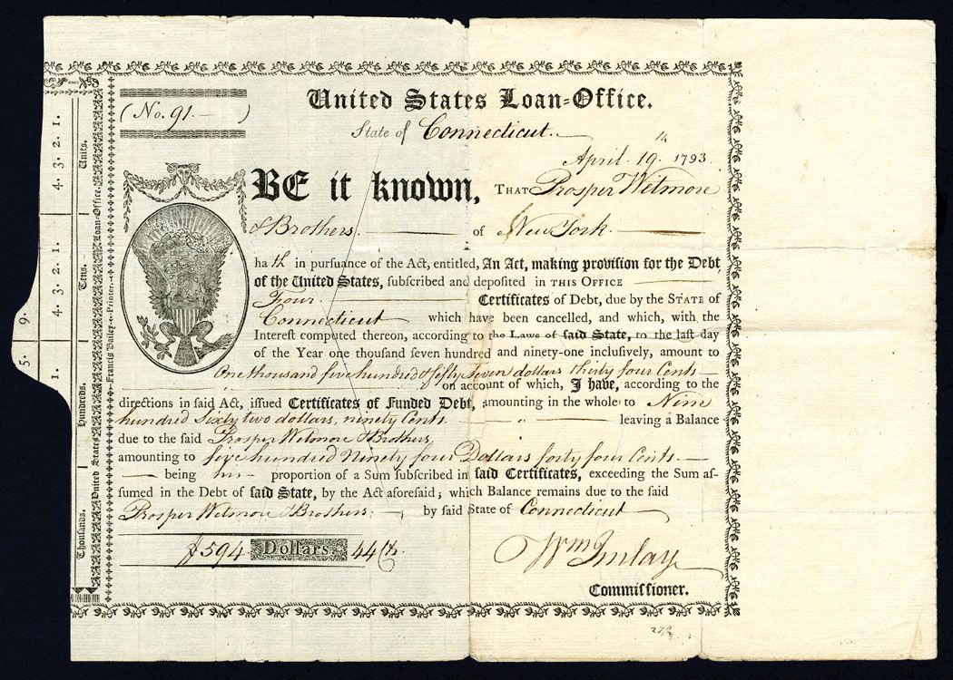 Connecticut, $594.44 payable to Prosper Wetmore Brothers, April 19, 1793, and signed by Wm. Imlay, cut cancelled, strong vertical middle fold, but still very attractive and in Fine condition.