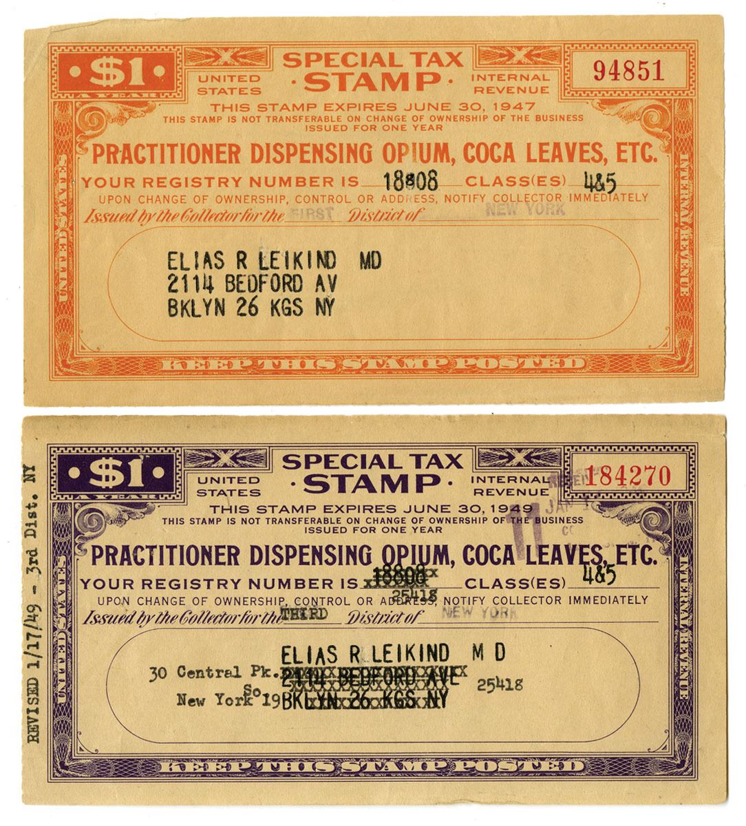 New York, 1947 & 1949. Lot of 2 Special Tax Stamps, Issued to a Practitioner Dispensing Opium, Coca Leaves, Etc., First is Orange and other is Purple, VF condition. (2). Sold "AS IS" no returns accepted.