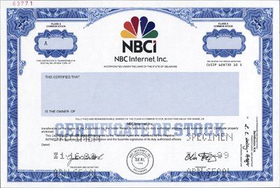 ca.1980's-2000. 7 different specimens. Companies include: NBC Internet Inc. (2), Online Resources & Communications Corp., WebEx Communications Incorp., Netlive Communications Incorporated and iBEAM Broadcasting Corp. All are scarce and many have never been seen before. All have a variety of vignettes, share class and colors. All in XF condition.