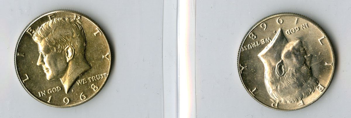 U.S., 1968-D. Lot of 2 Kennedy Half Dollars struck at the Denver Mint and composed of .400 silver clad composition during the transitional silver coinage period. Each coin weighs 11.50 grams with a silver fineness of .400, giving an actual silver weight (ASW) of 4.60 grams per coin (0.1479 troy oz). Total weight for the lot is 23 grams, with a total ASW of 9.2 grams (0.296 troy oz) of silver. (2). Sold "AS IS" no returns accepted.