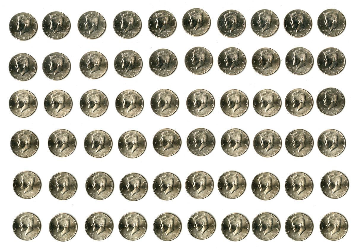 Washington, D.C., Lot of 3 Uncirculated rolls of 20 coins each of Kennedy Half Dollar Coins, Includes: 2002-D; 2003-P, and 2003-D. Coins are in UNC to CU condition or Better condition. ($30 FV) (60 coins in 3 uncirculated rolls of 20 coins each.)
