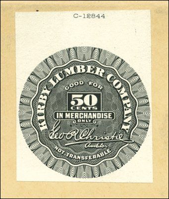 1900's. P-Unlisted. 5cts; 10cts; 25cts; 50cts. Proof. All are around 1.75 inches in diameter and are cut down large die proofs printed on india paper mounted on manila file storage envelope. All have plate numbers at top. 1)to5) 5 cents; 10 cents; 50 cents; $1.00 printed in black with signature of George R. Christie. 6) $1.00 printed in red with signature of R.F.Ford. These were scrip notes that would have been printed on a circular thin cardboard the size of the note. The workers were paid with this scrip which states "Good for ($ amount) in merchandise only." The Kirby Lumber Company was formed in 1901 by John Henry Kirby in East Texas to manufacture and transport lumber. Between 1910 and 1920 he had over 16,500 employees, 5 logging camps and 12 lumber mills. He was president of Southwestern Oil Company of Houston in the early 1900's and formed in Kirby Oil Company in 1920. Only Enron's recent failure eclipsed Houston's prior largest bankruptcy, that of John Henry Kirby whose 40 million dollar twin oil and timber companies entered receivership in 1904 and whose Kirby Lumber company declared bankruptcy in 1934. Kirby's Houston Oil Company became Houston Natural Gas in the mid 1920's, which in turn became Enron in the 1980's. Unique in this form. Only 2 complete sets found. ABN. Unc.