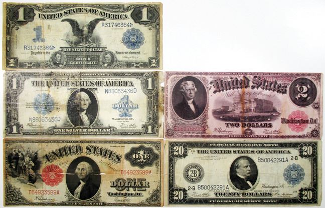 Washington, D.C., Lot of 5 notes, Includes 1899, $1, Silver Cert; 1914, $20, New York Branch F.R.N.; 1917, $1 and $2 U.S. Notes; and 1923, $1, Silver Certificate, all with minor condition problems, from VG to VF, some staining on the $2, 1917 note and others with small tears, splits or faults. (5)
