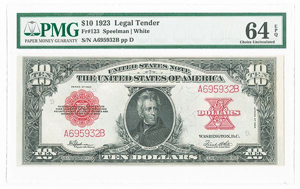 Washington, D.C., 1923, $10, Fr#123, Issued banknote, Jackson portrait, Red seal, S/N A695932B, Speelman | White signatures, PMG graded Choice Uncirculated 64 EPQ. An extremely attractive example of this twentieth century Large Size Type with bright, vivid colors and excellent embossing and totally original. This example is from the last pack of notes and is 68 numbers away from the last serial number issued for this outstanding banknote. The note had a run of 696,000 which was very small for this type. A lovely example that will be sure to attract serious interest.