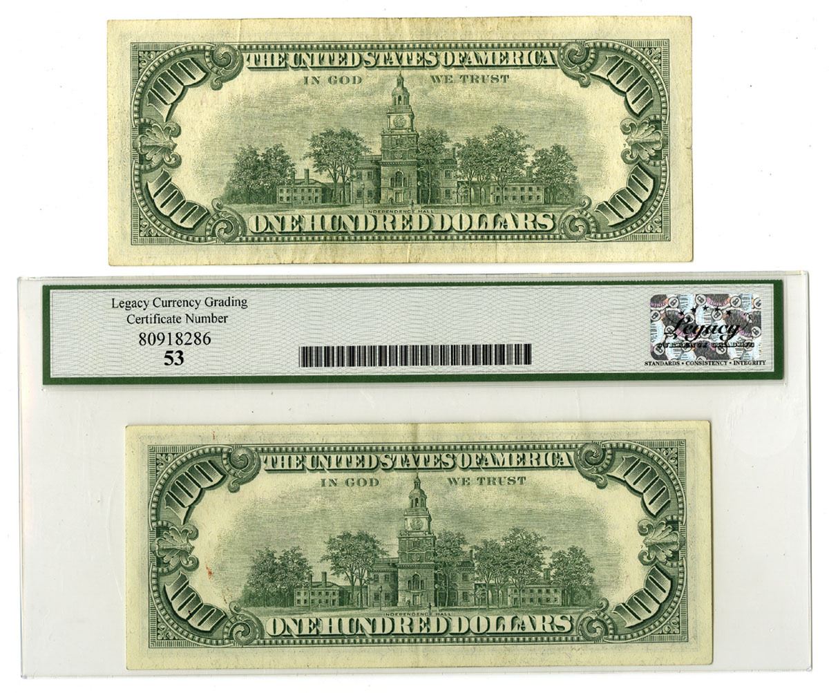 Washington D.C., 1966. $100, Series 1966, Fr.# 1550, Legal Tender Issued Banknote Pair, Black print with Benjamin Franklin at center and red seals at right, Back is green with Independence Hall at center, S/Ns A00265105A and A00503491A, One is Legacy graded About New 53. (2).