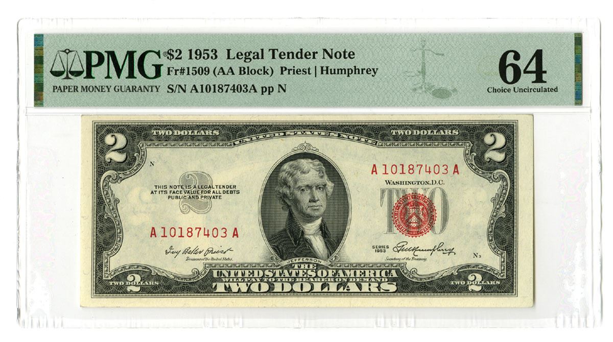 Washington D.C., 1953. $2, Series of 1953, Fr.#1509, AA Block, Issued Legal Tender Banknote, Red seal at right, Priest | Humphrey signatures, S/N A10187403A pp N, PMG graded Choice Uncirculated 64.