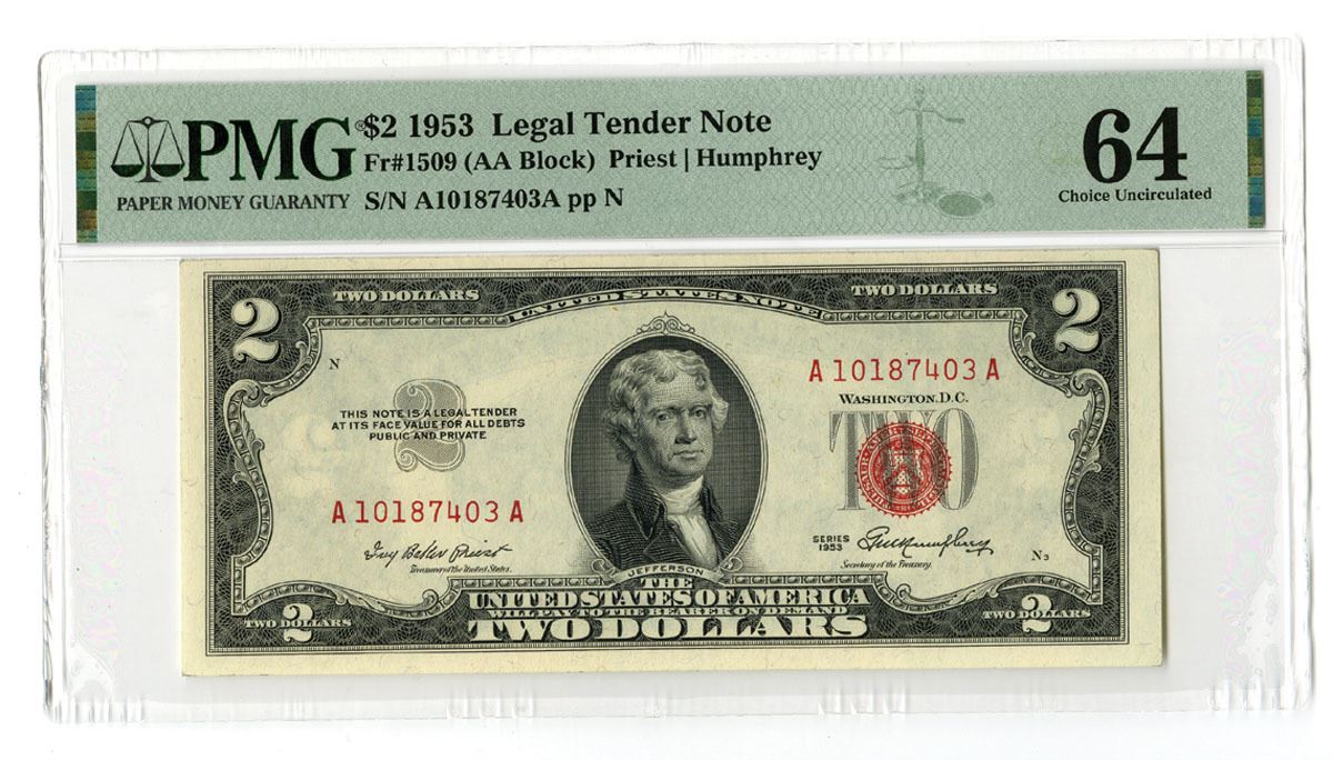 Washington D.C., 1953. $2, Series of 1953, Fr.#1509, AA Block, Issued Legal Tender Banknote, Red seal at right, Priest | Humphrey signatures, S/N A10187403A pp N, PMG graded Choice Uncirculated 64.