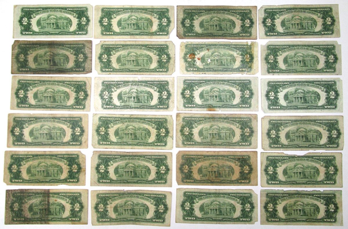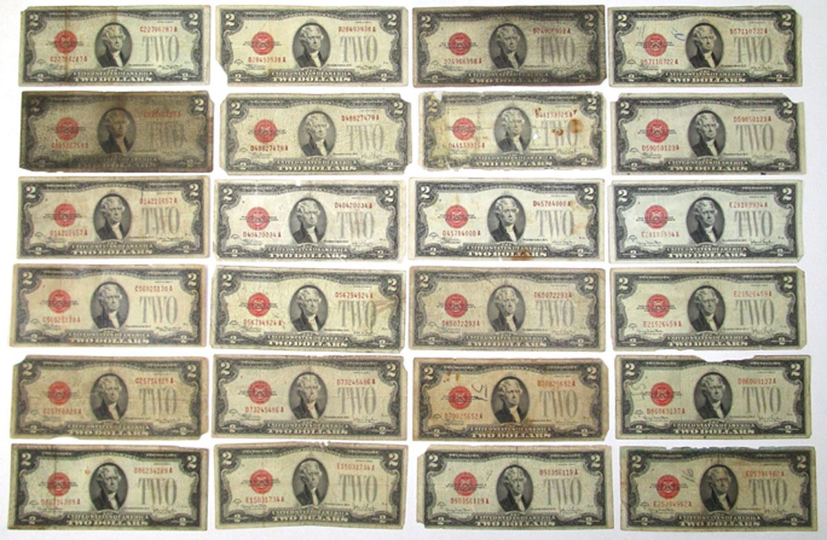 Washington D.C., 1928. Lot of 24 Legal Tender Notes, Includes: $2, Series of 1928D, Fr.# 1505 (6), Red seals at left, Julian | Morgenthau signatures; $2, Series of 1928F, Fr.# 1507 (11), Red seals at left, Julian | Snyder signatures; $2, Series of 1928G, Fr.# 1508 (7), Red seals at left, Clark | Snyder signatures. Notes range from Good with small faults (20 notes with high wear, small tears or rough edges or small pieces torn from the corners), to Fine to Choice Fine (4 notes) condition. (24).