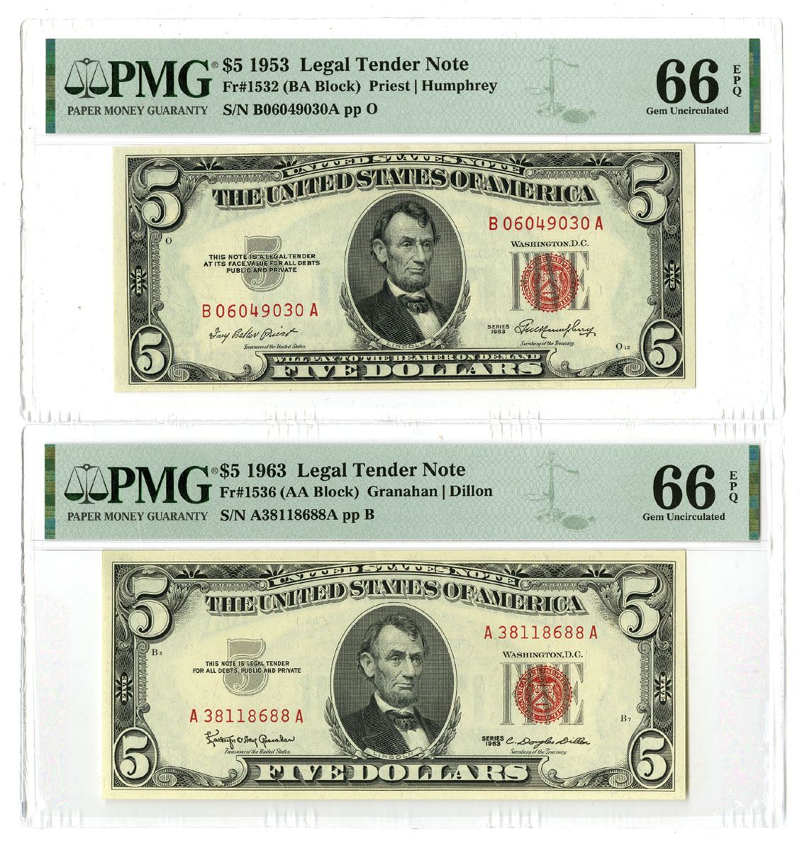 Washington D.C., 1953 & 1963. Lot of 2 Issued Banknotes, Includes: $5, Series 1953, Fr.#1532, BA Block, Priest | Humphrey signatures, S/N B06049030A pp O; $2, Series 1963, Fr.# 1536, AA Block, Granahan | Dillon signatures, S/N A38118688A pp B. Both notes are PMG graded Gem Uncirculated 66 EPQ. (2). Sold "AS IS" no returns accepted.