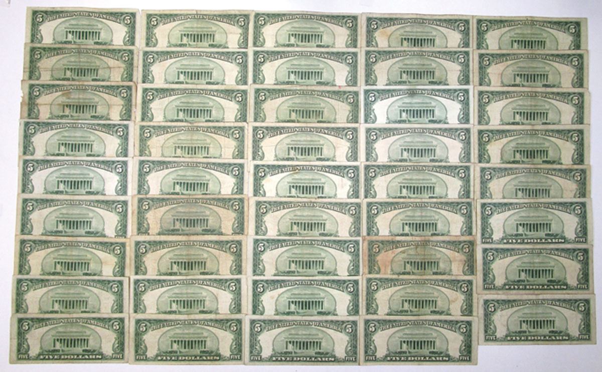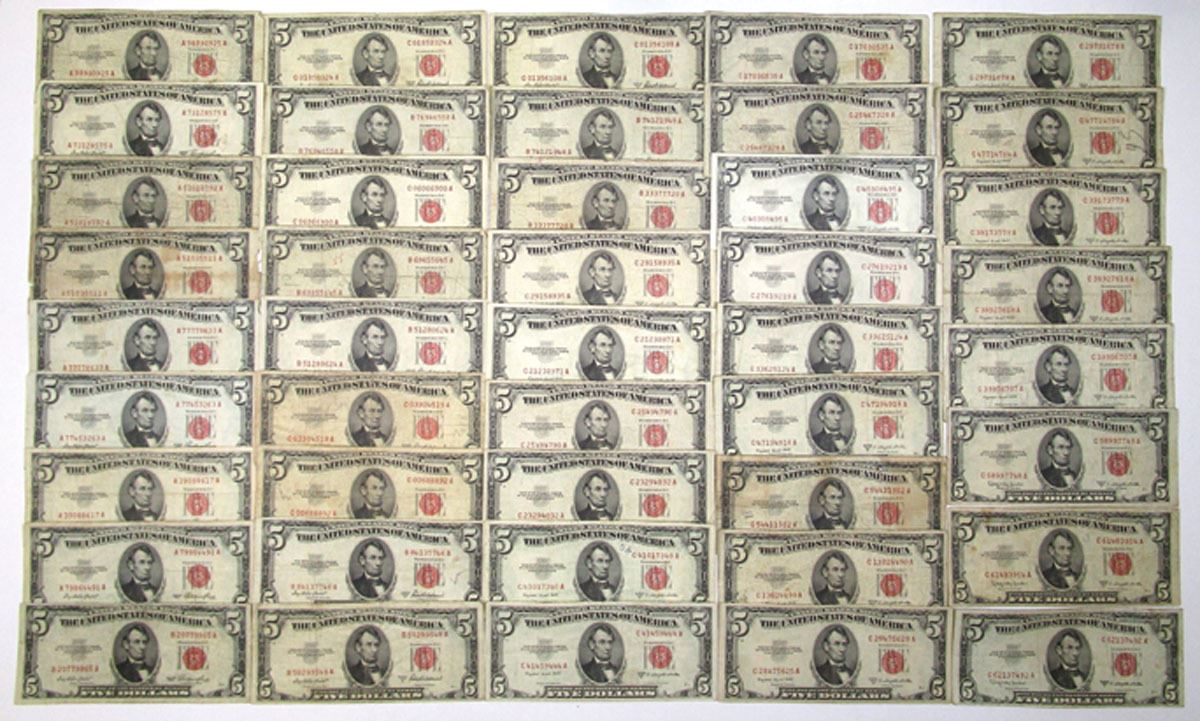 Washington D.C., 1953. Lot of 44 Issued Legal Tender Notes, Includes: $5, Series 1953, Fr.# 1532 (9); $5, Series 1953A, Fr.# 1533 (12); $5, Series 1953B, Fr.# 1534 (20); $5, Series 1953C, Fr.# 1535 (3). Notes all have red seal at right and range from Choice Fine to Choice VF condition. (44).