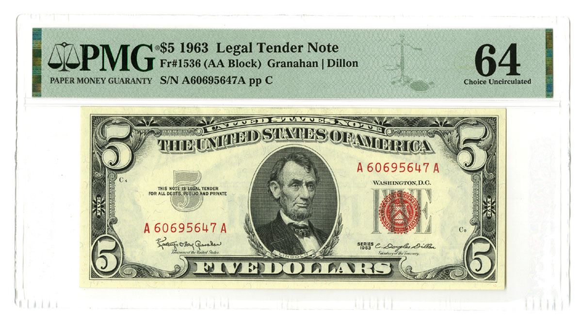 Washington D.C., 1963. $5, Series 1963, Fr.# 1536, AA Block, Issued Legal Tender Banknote, Red seal at right, Granahan | Dillon signatures, S/N A60695647 pp C, PMG graded Choice Uncirculated 64.