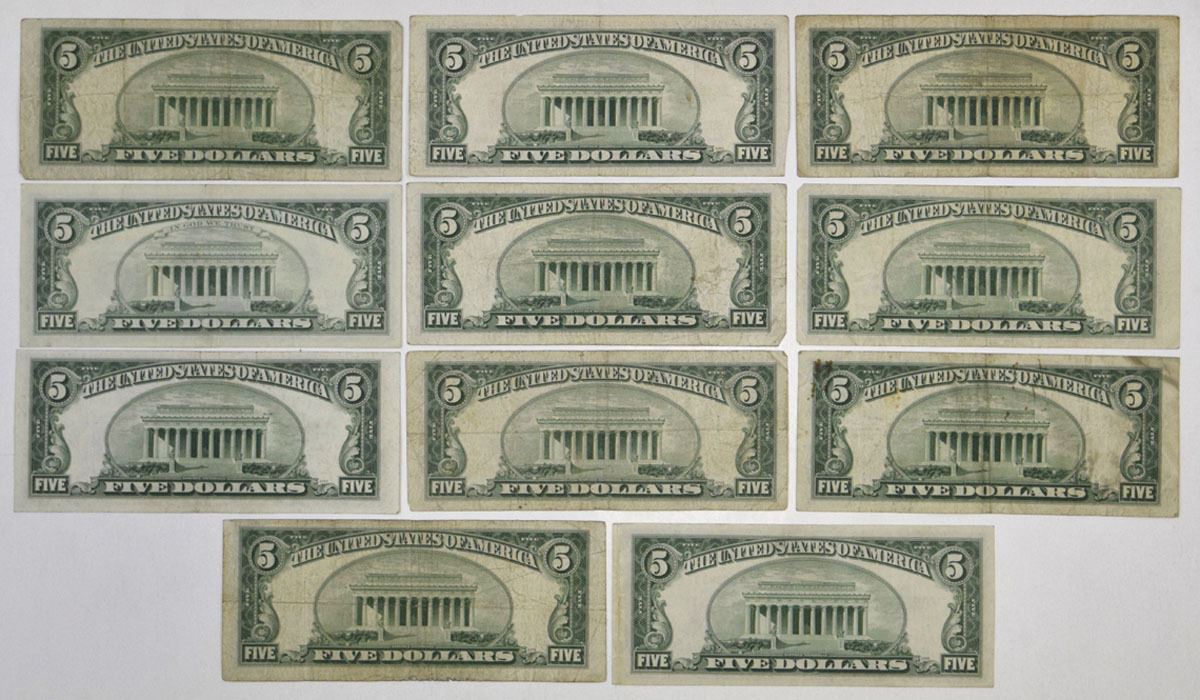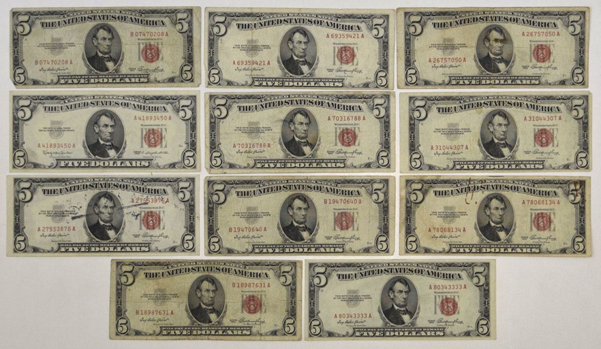 Washington D.C., Lot of 11 Legal Tender Red Seal 1953. $5, Series 1953, Fr.#1532 notes, Priest | Humphrey signatures, Red seal at right, Notes are in Good to Choice VG to VF+ condition. (11). Sold "AS IS" no returns accepted.