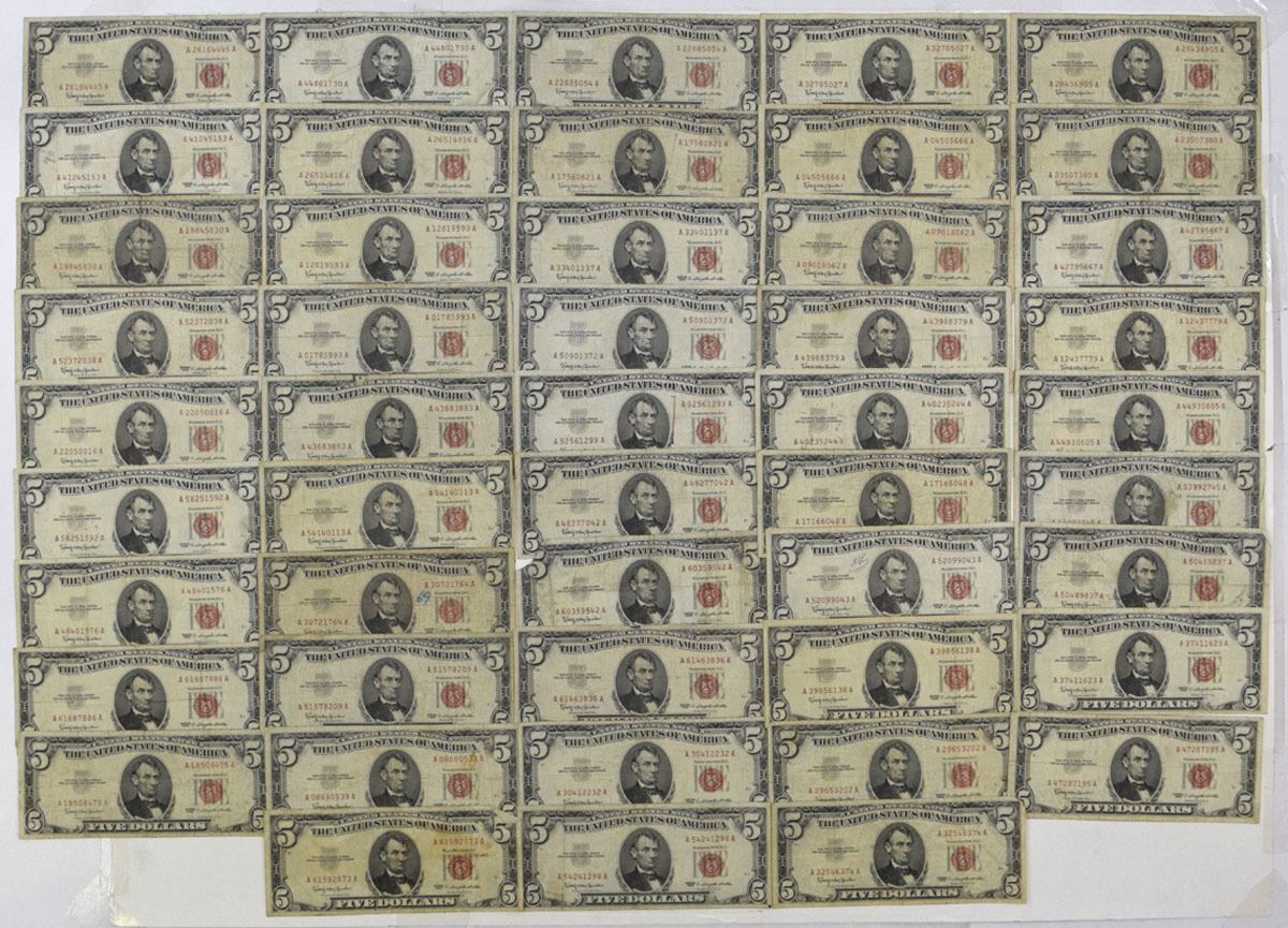 Washington D.C., Lot of 48, 1963. $5, Series 1963, Fr.#1536, Legal Tender Banknote group, Red seal at right, Granahan | Dillon Signatures, Notes range from Fine to VF condition. ($240 Face value), (48). Sold "AS IS" no returns accepted.