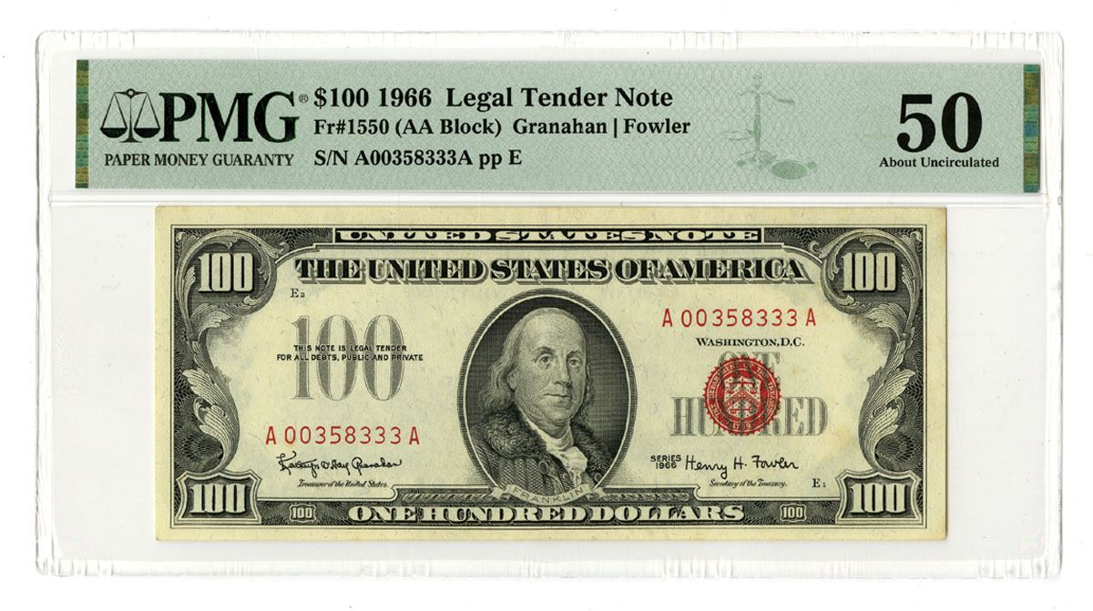 Washington, D.C. Series of 1957, $100 Legal Tender, Red Seal, Fr#1550 (AA Block), Granahan | Fowler signatures, S/Ns A 00358333A, PMG graded About Uncirculated 50. BEP.