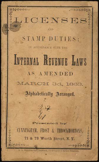 "Licenses and Stamp Duties in Accordance With The Internal Revenue Laws as Amended March 3rd, 1863. Alphabetically Arranged. Presented by Cunningham, Frost & Throckmortons, 71 & 73 Worth Street, N.Y." (Next to my old office and City Hall). 32 pages with orange-buff cover that is a little beat up, but the interior is in exceptional condition and other than a few toning spots and 2 small areas cut out of the 1st and last page margins, is in exceptionalcondition. Everything you ever wanted to know about 1863 stamp duty tax rates is here. Extremely detailed and informative for the serious revenue collector. Printed by G.A.Whitehorne, 119 Fulton & 42 Ann Streets, NY. Rare.