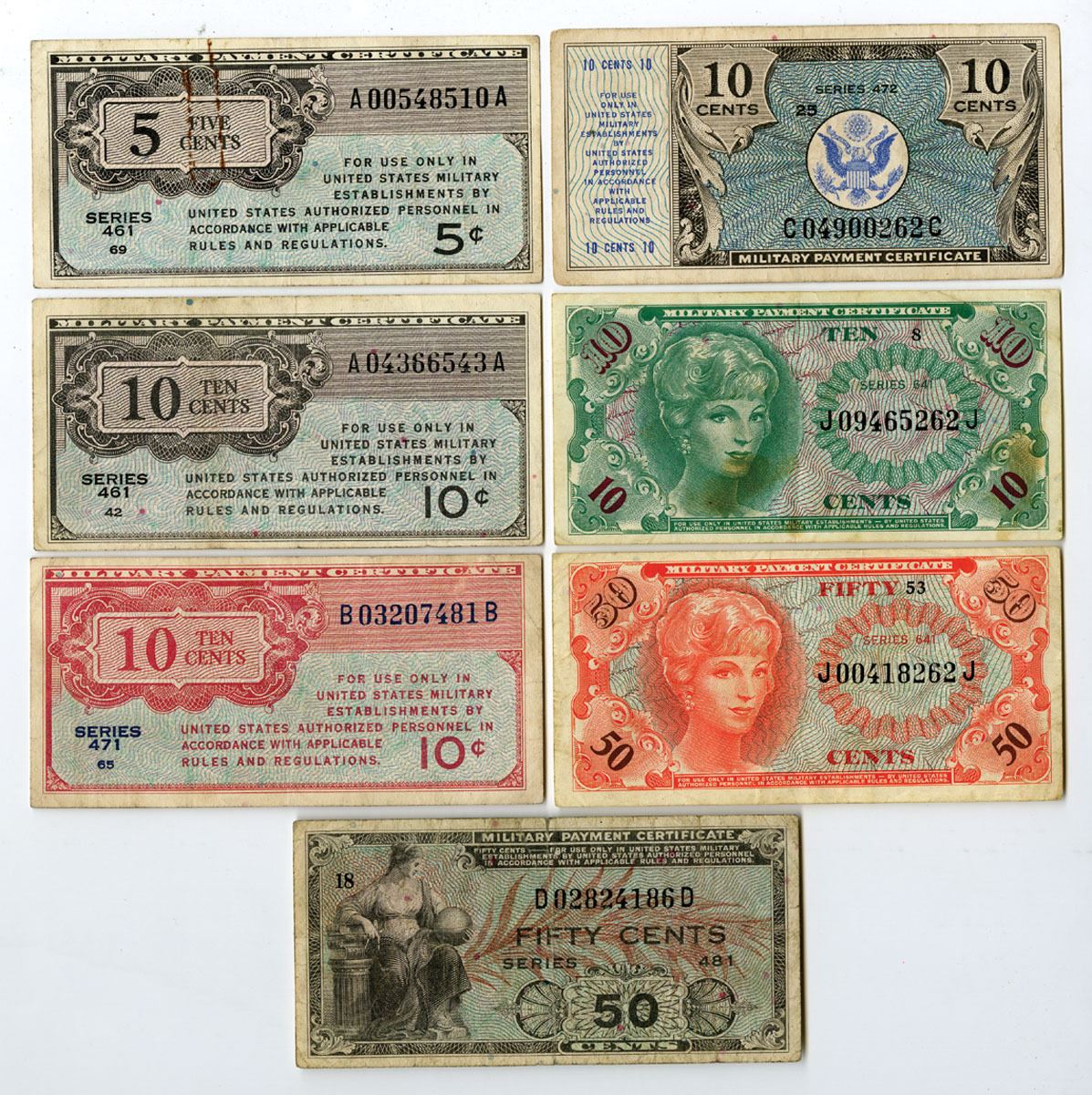 U.S.A., ca.1946 to 1965É. Lot of 7 Issued MPC, Includes: 5 Cents, P-M1; 10 Cents, P-M2; 10 Cents, P-M9; 10 Cents, P-M16; 50 Cents, P-M25; 10 Cents, P-M58; 50 Cents, P-M60. Notes range from Fine to VF condition. (7). Sold "AS IS" no returns accepted.