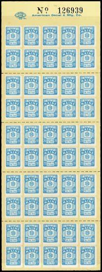 20 Cigarettes Tax Paid uncut sheet of 5 panes of 10 stamps each (50 stamps). Top margin has imprint of printing company "American Decal & Mfg. Co.", serial # 126939 (2 small staple holes on top border)and printer union logo. Printed on decal sheet in light blue with Arms of Maine in middle. From the archives of ABNC and was probably used for reference. One stamp on the bottom right corner has a bent corner, other wise the sheet is in choice condition.