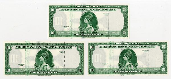 U.S. & Malaysia. Lot of 3 notes, all are ABNC, 1929 (ca.1960-80's) 10 Denomination Sample Test Note w/ "Tiger" Watermark used on Malaysia banknotes. Green without underprint, Security thread at right, back black, Green vertical ink smear on left and black ink smear in middle on back, choice to Gem Uncirculated. ABNC