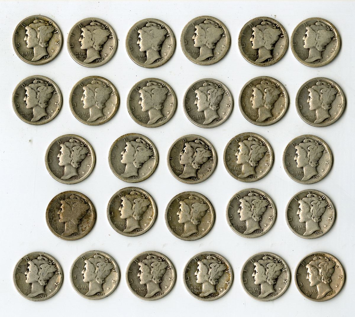 Washington D.C., 1916-39. Lot of 28 Silver Mercury Dimes, Includes: 1916-P, 1917-S, 1917-P (4), 1918-S, 1918-P (2), 1919-S (3), 1920-P, 1920-D (2), 1923-P, 1924-S, 1925-S (2), 1925-P, 1926-S, 1926-P, 1927-D (2), 1927-S (3), 1939-D. Coins range from Good to VF. (28 coins or $2.80 Face of 90% Silver).