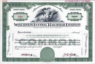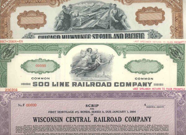 ca.1930-50's. 10 different specimens. All different colors and share amounts. All with various vignettes. Railroads include: Chicago Milwaukee St. Paul and Pacific Railroad Co. (4); Wisconsin Central Railroad Co. (3) and Soo Line Railroad Company (3). All in XF condition. ABNC, SBNC.