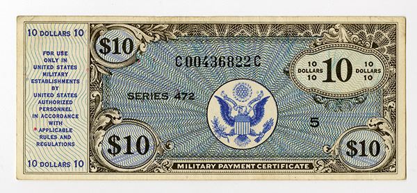 U.S. MPC, $10, P-M21, issued banknote, Black on blue underprint, Seal of the U.S., Choice Fine to VF condition.