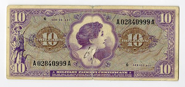 U.S. MPC, $10, P-M74, issued banknote, Violet on m/c underprint, Woman at center, Fine to Choice Fine condition.