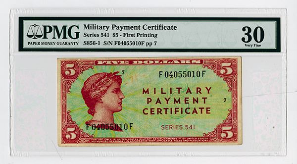 United StatesÉ.. Military Payment Certificate, ND (1958), Series 541, $5, First Printing, P-M41, S-856-1, Issued note, red and green on front, Portrait of woman at left, S/N F04055010F pp 7. PMG graded Very Fine 30 with note of Annotation Lightened.