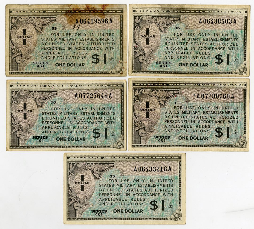 Washington, D.C., ND (1946). Series 461, Lot of 5 issued banknotes, All are $1, P-M5a, Issued Banknotes, Gray on light blue underprint, Series 461, 1 note is in Choice VG to Fine condition with stains or rust; 1 Note is in Choice Fine condition; and, 3 notes are in VF to Choice VF condition. (5). Sold "AS IS" no returns accepted.