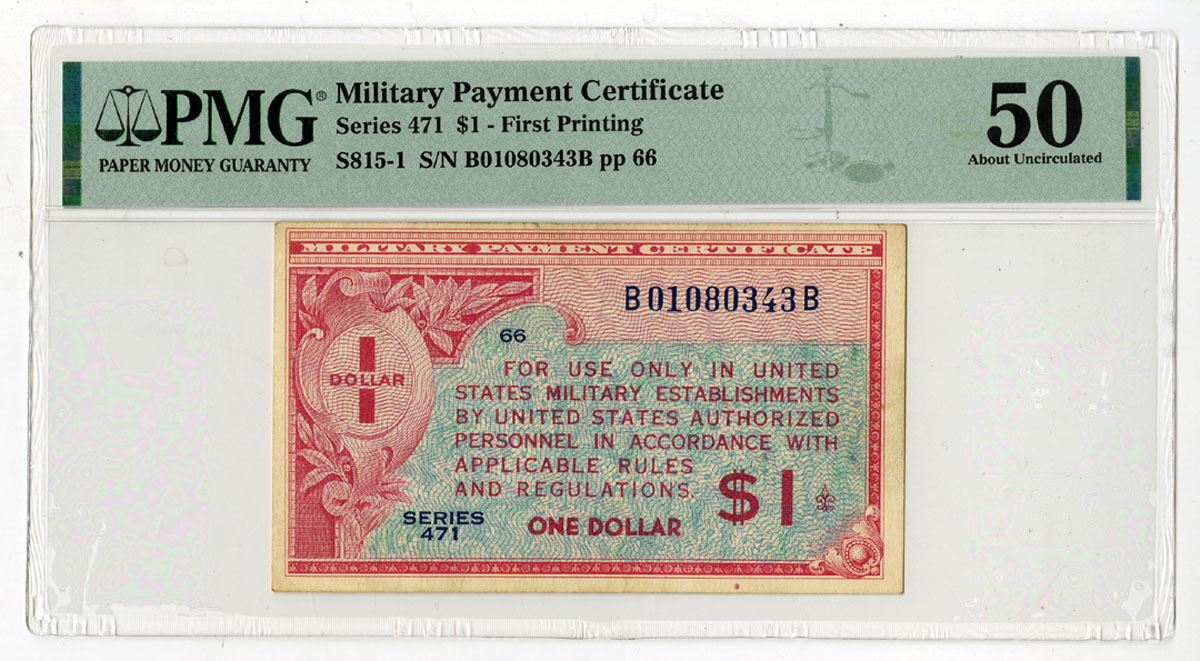 Washington, D.C., ND (1947). 1 Dollar, P-M12a S815-1, Issued Payment Certificate, First Printing, Red and blue print, Back has seal of the U.S., S/N B01080343B pp 66, PMG graded About Uncirculated 50.