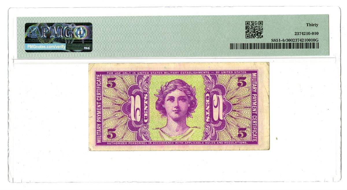 Washington, D.C., ND (1958). Series 541, $5, P-M36r, Fourth Printing Replacement Banknote, Violet on green and yellow-green underprint, Woman with wreath at left, Back is purple and green with woman at center, S/N F02665099 pp 82, PMG graded Very Fine 30.