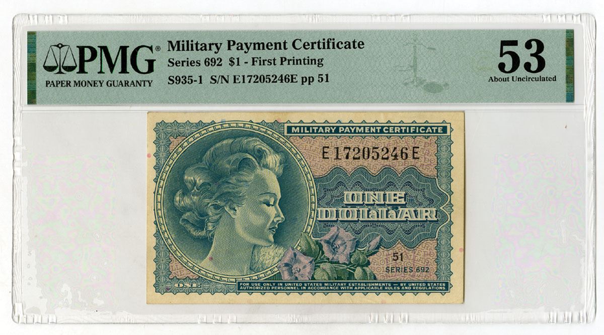 Washington, D.C., ND (1970). $1, P-M95a S935-1, Issued Payment Certificate, First Printing, Blue-green on m/c underprint with portrait of a woman facing to the right at the left side with flowers at bottom, Back shows buffalo at center, S/N E17205246E pp 51, PMG graded About Uncirculated 53