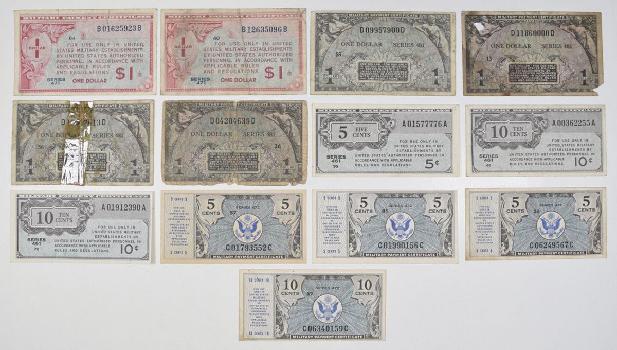 Washington, D.C., ND (1946-51). Lot of 13 Issued Military Payment Certificates, Includes: Series 461, ND (1946), 5 Cents, P-M1a; ND (1946), 10 Cents, P-M2a (2); Series 471, ND (1947), 1 Dollar, P-M12a (2); Series 472, ND (1948), 5 Cents, P-M15a (3); ND (1948), 10 Cents, P-M16a; Series 481, ND (1951), 1 Dollar, P-M26a (4). Notes range from Good to VF+ condition. (13). Sold "AS IS" no returns accepted.
