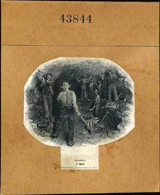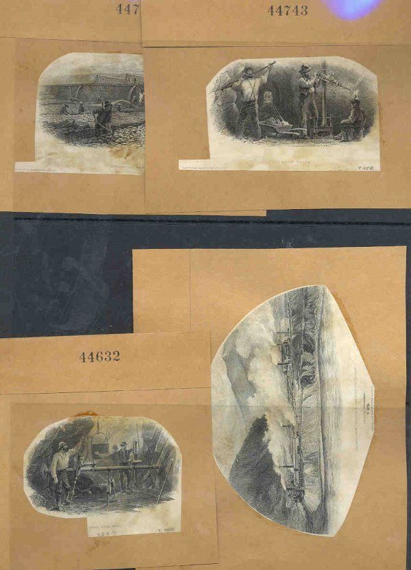 ca.1860's-1920's. 10 different vignettes of miners working in mines, hydraulic mining; placer mining and mining views and scenes used on stocks, bonds, checks and security printed documents. Titles include "Placer Mining"; "Alice Gold & Silver Mining Co."; " Coal"; "Silver Mines - Nevada"; "Little Giant Hydraulic Mining"; "Rand Rock Drill"; "Hydraulic Mining"; "Rock Drill" and other titles and untitled. The vignettes range from 1.5 to 4 inches in size. All are printed on india paper and mounted on manila cards. All are in VG to Fine condition with minor (no pun intended) faults. Please inspect. Extremely attractive and rare group of early mining vignettes. ABNC.