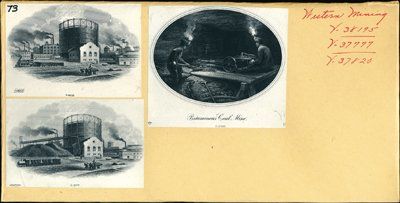 ca.1880's-1920's. 24 different mining related proof vignettes of miners working in mines, coal trains, coal mines, steel mills, oil wells and other images from a number of printers. Most of these images were used on stocks, bonds, checks and security printed documents. The vignettes range from 1.5 to 4 inches in size. Titles include "Bituminous Coal Mine No.1"; "Miner"; "Mining" and the balance untitled. All are printed on india paper and mounted to large archival manila envelopes. Printers include ABNC; FBNC; Franklin-Lee BNC; IBNC and other unattributed. All are in Fine to choice uncirculated condition. Please inspect. Extremely attractive and diverse group of mining vignettes.
