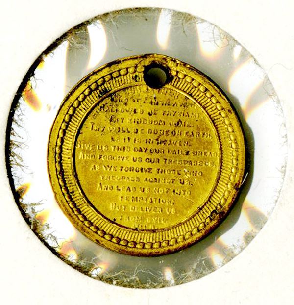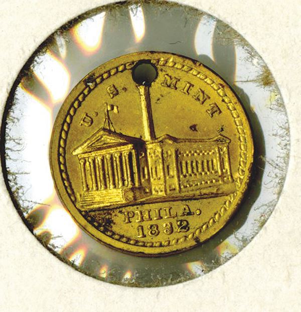 Third U.S. Mint Building in Philadelphia, Lord's Prayer on reverse. 13mm. Gilt, holed as made.