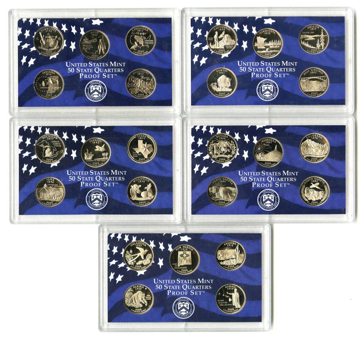 Lot of 5, 2002; 2004; 2005; 2006; and, 2008, Proof Quarters Sets, Includes: 2002 with Tennessee, Ohio, Louisiana, Indiana, and Mississippi; 2004 with Michigan, Florida, Texas, Iowa, and Wisconsin Quarters; 2005 with California, Minnesota, Oregon, Kansas, and West Virginia; 2006 with Nevada, Nebraska, Colorado, North Dakota, and South Dakota; and, 2008 with Oklahoma, New Mexico, Arizona, Alaska, and Hawaii. Sets are in their original packing with Certificates of Authenticity and are in Superb Gem UNC condition. (5 Sets).