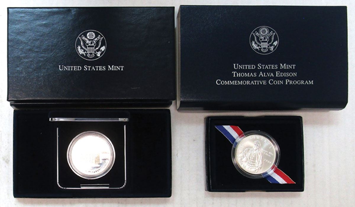 Washington D.C., 2001 and 2004. Lot of 2 Silver Dollars, Includes: 2001, Capitol Visitor Center Proof Silver Dollar featuring the Old Capitol Building in 1800 with the new Capitol in the background on obverse, while reverse shows contemporary interpretation of the U.S. Double Eagle; and, 2004, Thomas Alva Edison Uncirculated Commemorative Silver Dollar featuring Edison holding an experimental light bulb in lab on obverse, while reverse shows rays of light radiating from an 1879 light bulb. Both coins are 90% Silver, come in original packaging from the U.S. Mint, and have certificate of authenticity. Coins are in Superb proof or uncirculated condition with a total of 53.46 grams of .999 silver with a silver melt of over $60. (2). Sold "AS IS" no returns accepted.