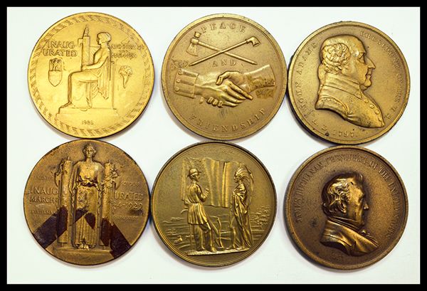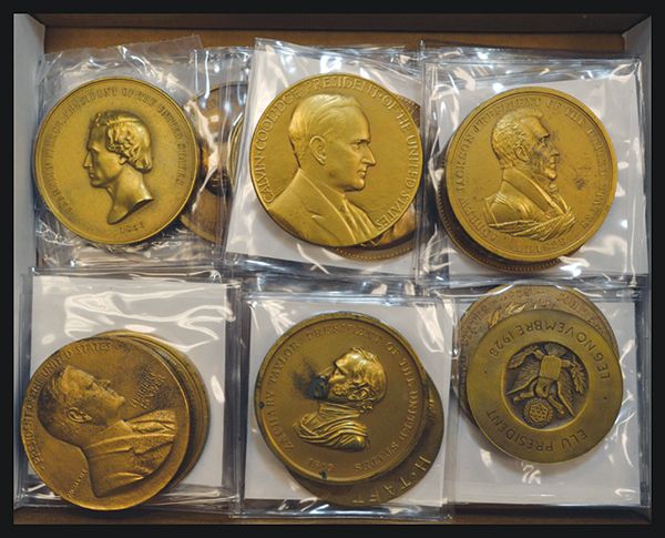 U.S. Mint Presidential and Indian Peace Medals Mostly Issued in bronze by the U.S. Mint. 3". George Washington; John Quincy Adams; John Adams; William Taft; James Buchanan; Zachary Taylor; Franklin Roosevelt; Benjamin Pierce; Andrew Jackson; William Harrison; Harry Truman; John Tyler; Chester Arthur; Rutherford Hayes; Grover Cleveland; Herbert Hoover; Abraham Lincoln; Benjamin Harrison; Warren Harding; James Madison; James Polk; Millard Fillmore; Martin Van Buren; Woodrow Wilson; Andrew Johnson; James Monroe; Calvin Coolidge; Benjamin Harrison. Also included is a Nixon-Agnew medal, and a Herbert Hoover ELU President November 6, 1928 medal. Some light mounting remnants and stains. [30], weight approximately 16 lbs.