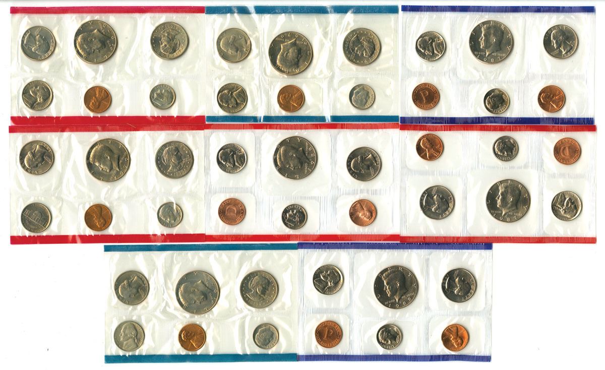 Lot of 4 U.S. Mint Uncirculated sets including two from 1979, one 1987, and one 1988, all in original packaging and envelopes. Each set contains 12 coins (Philadelphia and Denver issues for each denomination), for a total of 48 coins in the lot. Coins are struck in standard circulating compositions (no silver issues present), with approximate weights per denomination of 3.11 grams (cent), 5.00 grams (nickel), 2.27 grams (dime), 5.67 grams (quarter), 11.34 grams (half dollar) and 8.10 grams (dollar), giving an approximate total weight of 284.00 grams for all coins combined. Silver fineness is 0.000 for all coins, resulting in an actual silver weight (ASW) of 0.00 grams. Coins appear Uncirculated as issued with light toning from original packaging. (48 coins, 4 sets). Sold “AS IS” no returns accepted.