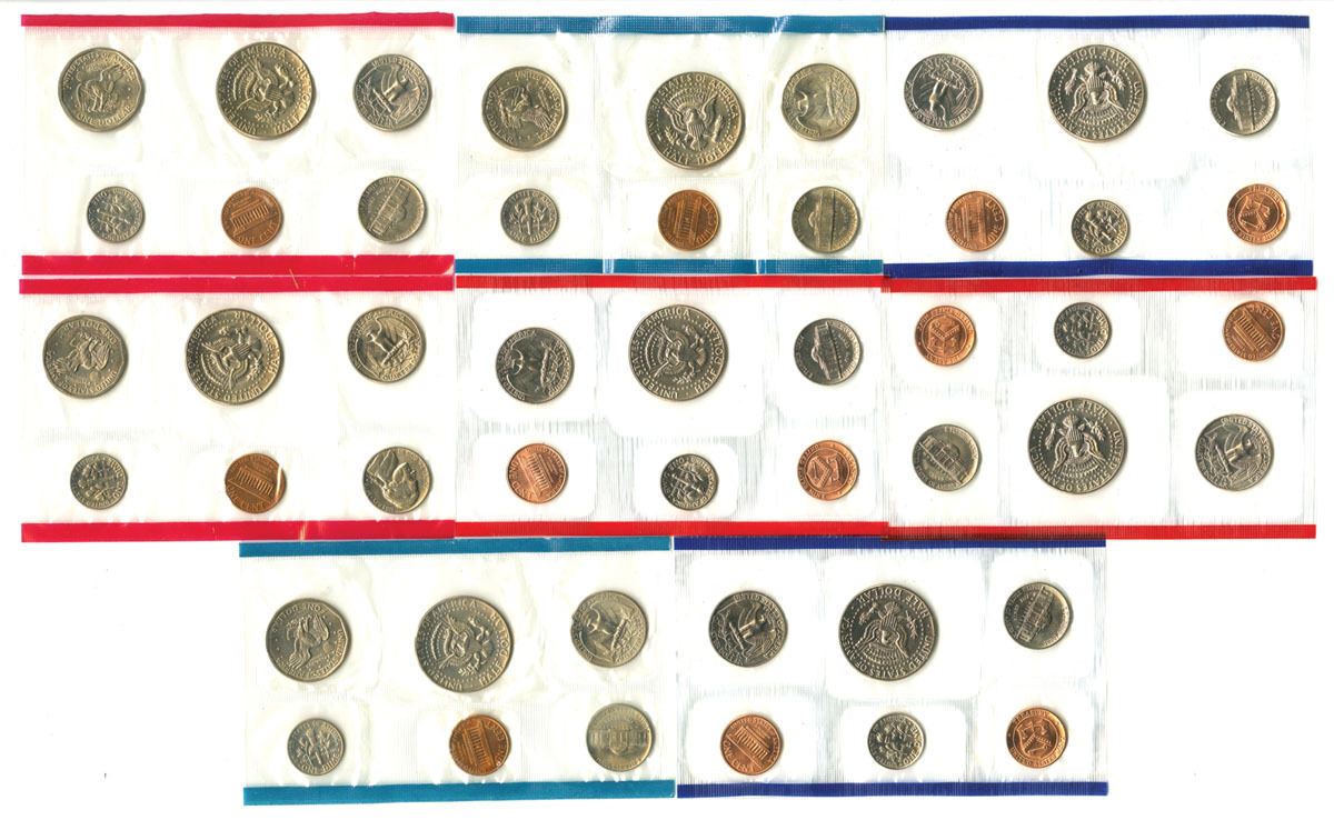 Lot of 4 U.S. Mint Uncirculated sets including two from 1979, one 1987, and one 1988, all in original packaging and envelopes. Each set contains 12 coins (Philadelphia and Denver issues for each denomination), for a total of 48 coins in the lot. Coins are struck in standard circulating compositions (no silver issues present), with approximate weights per denomination of 3.11 grams (cent), 5.00 grams (nickel), 2.27 grams (dime), 5.67 grams (quarter), 11.34 grams (half dollar) and 8.10 grams (dollar), giving an approximate total weight of 284.00 grams for all coins combined. Silver fineness is 0.000 for all coins, resulting in an actual silver weight (ASW) of 0.00 grams. Coins appear Uncirculated as issued with light toning from original packaging. (48 coins, 4 sets). Sold “AS IS” no returns accepted.