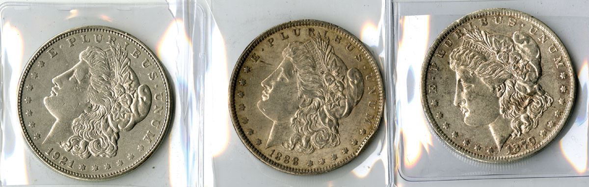 U.S., 1879-1921. Lot of 3 Morgan Silver Dollars including 1888 P, Philadelphia Mint (1888),1879-O, and Micro mintmark on the 1921-D, Each coin is struck in the standard Morgan Dollar composition of 26.73 grams with a silver fineness of .900, giving an actual silver weight (ASW) of 24.06 grams per coin (0.7734 troy oz). Total weight for the lot is 80.19 grams, with a total ASW of 72.18 grams (2.320 troy oz) of silver. VF to Choice VF condition. Coins display the Liberty head obverse and heraldic eagle reverse designed by George T. Morgan, used on U.S. silver dollars struck from 1878 to 1921. (3). Sold “AS IS” no returns accepted.
