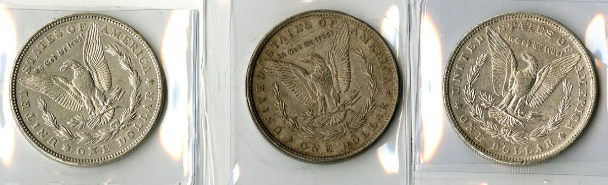 U.S., 1879-1921. Lot of 3 Morgan Silver Dollars including 1888 P, Philadelphia Mint (1888),1879-O, and Micro mintmark on the 1921-D, Each coin is struck in the standard Morgan Dollar composition of 26.73 grams with a silver fineness of .900, giving an actual silver weight (ASW) of 24.06 grams per coin (0.7734 troy oz). Total weight for the lot is 80.19 grams, with a total ASW of 72.18 grams (2.320 troy oz) of silver. VF to Choice VF condition. Coins display the Liberty head obverse and heraldic eagle reverse designed by George T. Morgan, used on U.S. silver dollars struck from 1878 to 1921. (3). Sold “AS IS” no returns accepted.