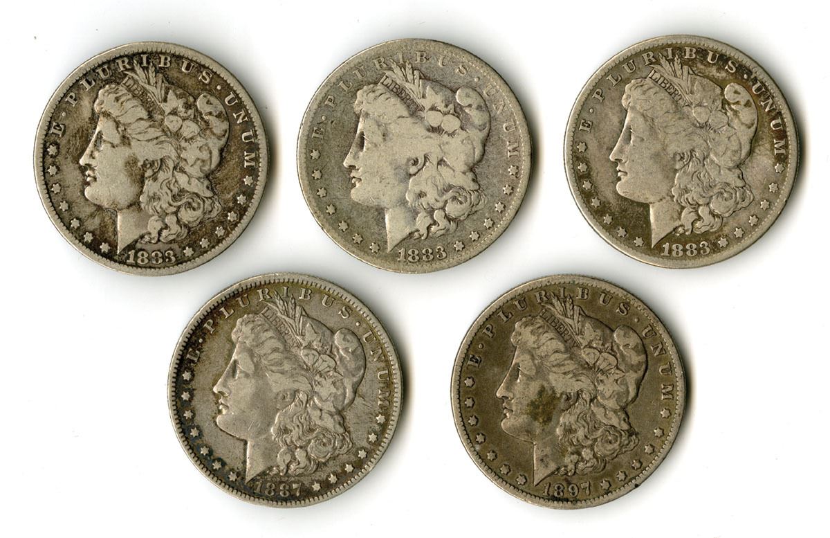 U.S., 1883-97. Lot of 5 Morgan Silver Dollars including three San Francisco Mint issues dated 1883-S (3) and two New Orleans Mint issues dated 1887-O and 1897-O. Each coin is struck in the standard Morgan Dollar composition of 26.73 grams with a silver fineness of .900, giving an actual silver weight (ASW) of 24.06 grams per coin (0.7734 troy oz). Total weight for the lot is 133.65 grams, with a total ASW of 120.30 grams (3.867 troy oz) of silver. Choice Fine to VF condition. Designs feature the Liberty head obverse and heraldic eagle reverse by George T. Morgan used on U.S. silver dollars struck from 1878 to 1921. (5). Sold “AS IS” no returns accepted.