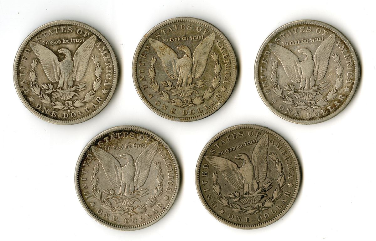 U.S., 1883-97. Lot of 5 Morgan Silver Dollars including three San Francisco Mint issues dated 1883-S (3) and two New Orleans Mint issues dated 1887-O and 1897-O. Each coin is struck in the standard Morgan Dollar composition of 26.73 grams with a silver fineness of .900, giving an actual silver weight (ASW) of 24.06 grams per coin (0.7734 troy oz). Total weight for the lot is 133.65 grams, with a total ASW of 120.30 grams (3.867 troy oz) of silver. Choice Fine to VF condition. Designs feature the Liberty head obverse and heraldic eagle reverse by George T. Morgan used on U.S. silver dollars struck from 1878 to 1921. (5). Sold “AS IS” no returns accepted.