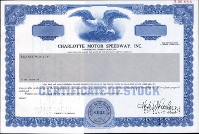 Harrisburg, NC, FL. ca.1970's-1990's. Odd Shares. 2 different specimen stock certificates. 1). Charlotte Motor Speedway, Inc., eagle vignette; 2). International Speedway Corporation, Color logo with initials. Scarce stocks of Nascar racing companies. SCBNC, ABNC.